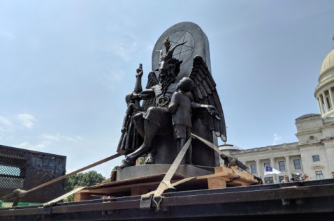 Satanists have brought a bronze statue of Baphomet, a winged-goat creature sitting on a throne flanked by two young children, to the Arkansas state capitol.